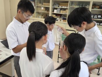 2年生理科。「化学変化と熱」。発熱反応と吸熱反応の実験をしていました。「本当だ!めちゃくちゃ下がった!」先生から「要はカイロとか熱冷ましと同じ原理」と説明されて納得。片付けも手際がいい2年生でした。