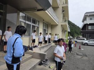 3日(金)は強歩大会に向けた試走の1回目が行われました。今回は「白糸の滝駐車場」を出発し、学校を目指します。ほとんどが下りのコースとなる所謂“復路”です。準備体操・ウォーミングアップを済ませた後に、車で駐車場まで向かいます。教頭先生は先導者となるため、一足先に電動自転車で向かいました。