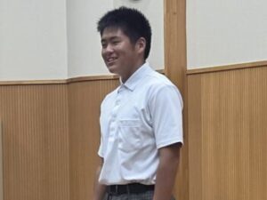 新人大会の壮行会に引き続き、8月30日に行われた北麓カーニバルで見事に円盤投げで優勝し、三重県で行われるジュニアオリンピックに参加する3年生男子の壮行会を行いました。これは生徒のみなさんにはサプライズ!校長が前に立ってエールを送らせてもらいました(^^;)ジュニアオリンピックは、17日(金)~19日(日)の日程で行われるということです。本人からは「自己ベストを出せるようにがんばる!」「できれば8位くらいに入れたら…」といった決意表明がありました。きっとがんばってきてくれることでしょう!がんばれ!