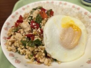 ガパオライスは「鶏肉」「だいず」「ピーマン」「にんにく」「たまねぎ」「パプリカ」「バジル」といろいろな食材が砂糖とこめ油で見事に味付けされています。さらにご飯の上にドーンと居座るのはなんとも立派なたまご。しかも半熟♪割って具と絡めて口の中に放り込むと…それはそれは美味しかったです(^o^)