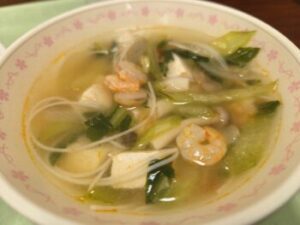 トムヤムクンスープも“なんちゃって”ではありません!「エビ」はゴロゴロ入っているし、「豆腐」「トマト」「にんにく」「しょうが」「たまねぎ」「しめじ」「レモン」「チンゲンサイ」「ビーフン」とこちらも超具だくさん♪何だか食べただけで元気になりそうなスープでした(^^)