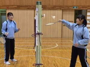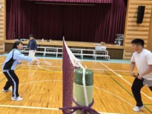 26日(木)は1,2年生は期末テスト一日目でした。そのため1,2年生は給食を食べて下校。午後は3年生のみが残って授業を受けます。5校時は体育。バドミントンです。とは言っても4人しかいません!