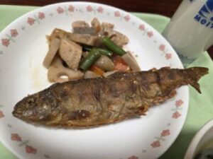 本日の給食は「中3リクエスト給食」ということで「わかめごはん」「牛乳」「ヤマメの唐揚げ」「筑前煮」「すまし汁」「焼きプリンタルト」。卒業生もよく分かっていますね!ラスト給食は、やはりTHE小菅給食の“ヤマメ”ですよね(^o^)見てください!皿からはみ出るほどのサイズ!口に入れるとサクサク感と香ばしさに感動♪そして噛んだときのジュワッと広がる旨み♪もちろん骨まで全て食べ尽くせます(^o^)「よく噛んで食べましょう」なんて給食メモがありましたが、あっという間に食べきってしまいました(^^;)いやいや今日も美味しかったです(^^)ごちそうさまでしたm(_ _)m