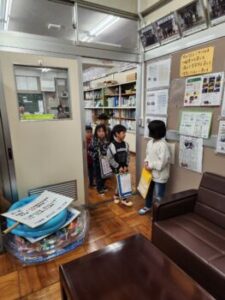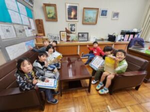 でーん!と小さなお客様が勢揃いしました。終始、校長室にある物を問う質問ばかりでした。校長先生は、「校長先生って何やっているんですか?」という質問が出ると楽しみに待っていたそうですが皆無でした。と苦笑いしていました。