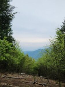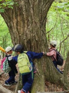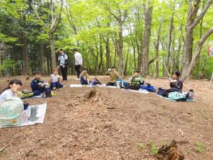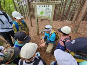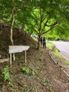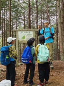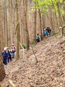 下山開始です。下りは膝にきます。厳しいですが、子どもは元気。途中、檜林でチェーンそうによる伐採作業に出くわしました。十数メートルの檜が音をたてて倒れて行きました。教科書の動画を目の前で見られた生きた学習です。