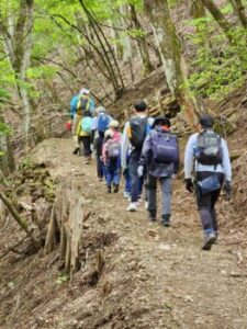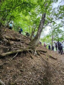 登山道へ入り登りだしました。結構本格的な山道です。地元にある源流大学の先生に案内をしていただきました。