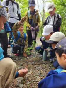 唐松林では種が落ちて小さな芽が発芽していました。マジマジ見る子どもたちです。