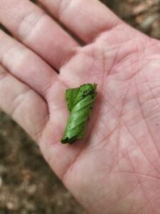 所々立ち止まり、素敵な動植物についての説明がありました。クルミの殻が落ちていました。きれいに食べてあるのはリス、汚くかじって食べてあるのはネズミ、違いがよくわかりました。この緑の葉に包まれているもの何かわかりますか?おとしぶみです。中には小さな卵が入っています。