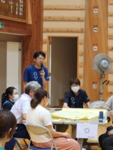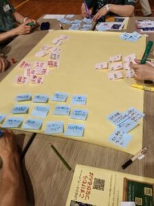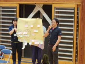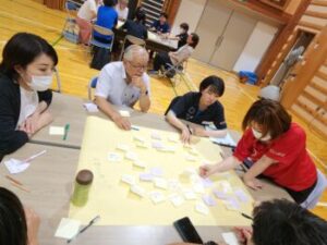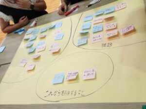 それからグループ内で付箋に書いた思いの丈を述べながら,部類分けをしました。これがいわゆる熟議です。グループごとやりかたはそれぞれですが,本当にいろいろな立場の方が混ざって子どもたちについて語り合いました。いいことも課題も含めて真剣に語り合う様子を見て,小菅の人たちって本当にすごいし温かいなと感銘を受けました。“子どもは村の宝”というだけあります。