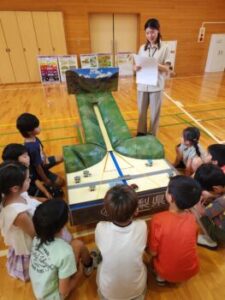 今日は富士・東部建設事務所の方々がお見えになり,以前から予定していた全校砂防教室が行われました。3年ほど前にも本校で行っていますので,5・6年生は記憶にあったようです。