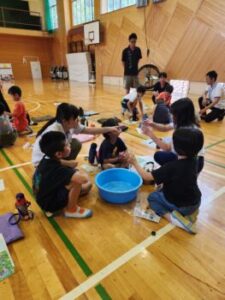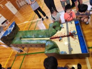 土石流,土砂崩れ(地滑り),崖崩れの違いを映像で勉強した後は,模型をつかって土砂崩れ実験です。模型といえども迫力がありました。ダムの役割もよく分かりました。土石流24カ所・地滑り8カ所・崖崩れ72カ所,この数は,小菅村内で対策をとっていかなければならない危険な場所だそうです。かなりありますね。