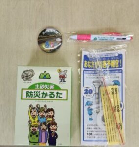 その他にも,防災かるた・缶バッジ・ボールペンなどまでいただきました。雨量計以外は,月曜日の持ち帰りとなります。防災かるたをご家族でやりながら,地震同様,土砂災害についても話題に出してもいいかもしれませんね。