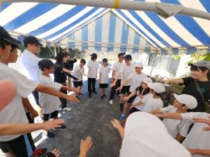 小中合同体育祭は,慣例で小学生が実行委員長をはじめ実行委員の主を務め,中学生がフォロにまわるという体制をとっています。「後輩たち頑張れよ,困ったときは先輩が助けてあげるからな!」と言われているかのようです。ちなみに合同体育祭の午後には,中学校の学園祭『明媚祭』が開かれ,こちらは中学生のみで催されます。