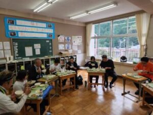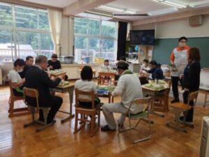 3・4年生です。一つの机を親子でシェアします。なかなかおもしろい隊形でした。「家で食べる量より全然多いです!」驚いている保護者の方もいました。適量ですので,これくらいは食べてほしいですとお話ししました。