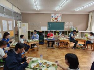 いつもながら美味しそうな献立です。ご家族もたいへん喜んでいました。低・中・高ブロックで食べますが,栄養教諭と養護教諭(給食担当)と校長が順に教室へおじゃまし,お話しをさせていただいたり,様子を見させていただいたりしました。