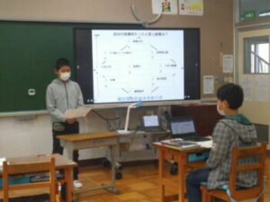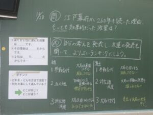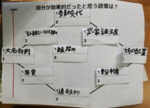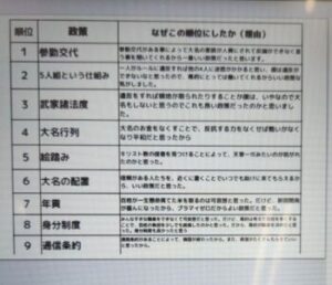 この児童は,1位:参勤交代,2位:5人組制度,3位:武家諸法度を上げました。もう一人の児童は,1位:参勤交代,2位:武家諸法度,3位:大名行列を上げました。二人だと淋しいので私も参加し,私は,1位:大名の配置(外様・譜代・親藩),2位:参勤交代,3位:武家諸法度を上げました。発表後は意見を交わし合い,互いの考えを学びあいました。とてもおもしろい授業です。本当はもっと人がいればいいのですがこれだけは無理なので,最後には参観の先生方にも子どもたちが聞きました。