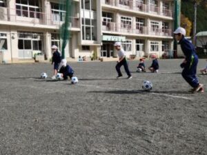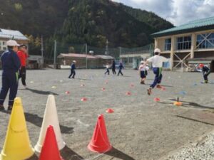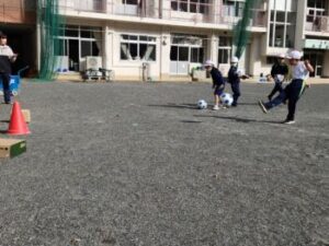 1・2年生は,ボールけり遊びです。段ボールやコーンを的にして,それらの的にボールを蹴り当てます。当たっても強くないと的は動きませんし倒れません。後半は赤白に分かれて1分間勝負をしました。蹴る→ボールを拾いに行く→ボールをセッティングする→蹴る,1分ですが繰り返すと結構忙しいです。最後に「校長先生と担任の先生でチャレンジだ!」ということで勝負してみたので,その忙しさと息苦しさがわかりました。