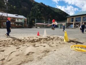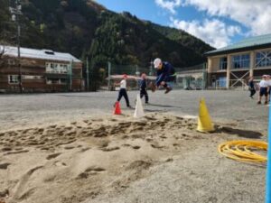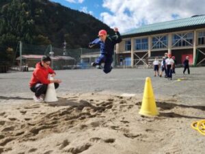 スポーツの秋です。体育の授業におじゃましました。3~6年生は合同で走り幅跳びの学習単元に入ったところでした。砂場に向かって走ってきて跳ぶので人気があります。