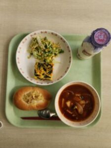 最後に今日の給食です。山梨ふるさと給食ウィーク2日目でした。明野金時パン,スパニッシュオムレツ,コールスローサラダ,甲州ワインビーフシチューでした。ごちそうさまでした。
