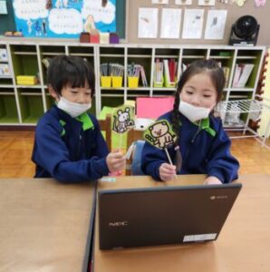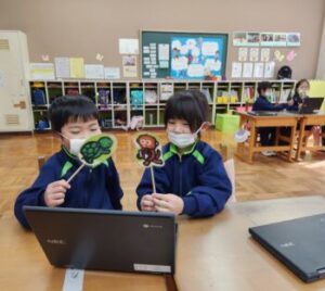 ぶたさんと,ねずみさんが,原っぱでお弁当を食べようとしている場面のようです。セリフがポンポンと出てきます。台本があるのかな?と思いきや,台本はありませんでした。自分たちの動きを録画することで,後で振り返ることができますし,全体で見せ合うこともできます。