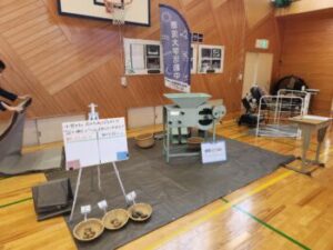 源流大学『大豆に混ざっている紙くずを取り除く農機具を使ってみよう!』