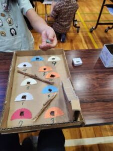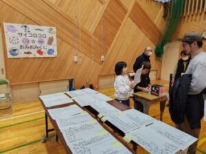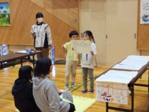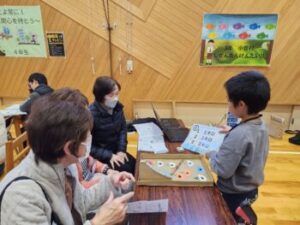 小菅村の自然をテーマにした動植物の問題が出されました。どの問題を出してもらうかは,手作りビー玉ゲームで決められます。写真のような段ボールと小枝を使ったピンボールのようなゲームです。店当番も威勢がよかったです。