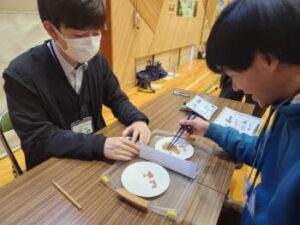 長年の伝統のようです。初級:落花生,中級:花豆,上級:大豆を箸でつかみ,30秒間に隣の皿に何個運べるかというゲームです。シンプルですが長蛇の列で人気がありました。PTA役員の皆様,伝統のすげやの営業をありがとうございました。