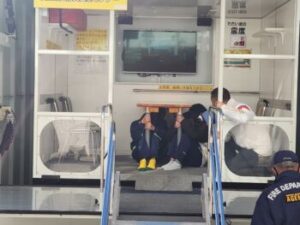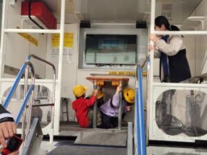 今日は県立防災安全センターをお招きし,起震車体験と発煙装置で煙を充満させた教室を歩く体験をしました。