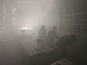 暗中模索。煙の中を歩くときは姿勢を低くし視線を下へ向けることで少しは見やすくなる。また手で回りを探りながら、そして前の人の服をつかみながら歩くと、少しは安全だと言うことを教わり実行しました。