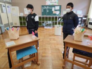 ヒノキなど村内にある木の皮を薄く細く長い帯状に切り,それを編み込んで籠などに仕上げるのが『きおび』です。6年生はここ10年くらいの間,『きおび』を生み出した先生を講師に招き,製作に取り組んでいます。今日(12月9日)を含めて4時間ほどかかります。6年生の2人と担任は今日で3時間目,初挑戦の私は1時間目ということで作業がはじまりました。