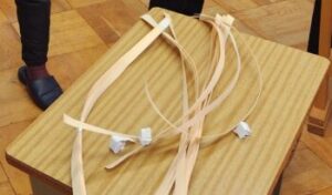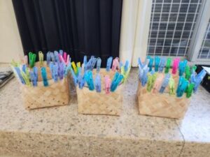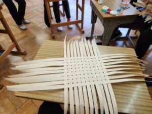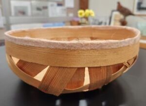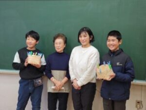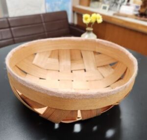そして完成しました。ボンドが固まるまでは洗濯ばさみは外せません。「王冠みたいだねえ」と。翌日には洗濯ばさみも外せます。手作りの『きおび籠』を何に使うのでしょうか?おやつ入れかな?だんだん飴色になってきて30年くらいもつ場合もあるそうです。冒頭に掲載してある籠は校長室に飾ってあるもので,だいぶ飴色になっています。