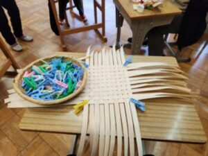 そして私です。計20本の帯を交互に編み込んでいきます。交互が簡単そうで意外と難しかったです。なぜかというと交互にしたつもりで交互になってないからです。「校長先生,手つきがいいですね!」励ましのお言葉をいただき,子どもは褒めて伸ばすいうことが身にしみてわかりました(笑)