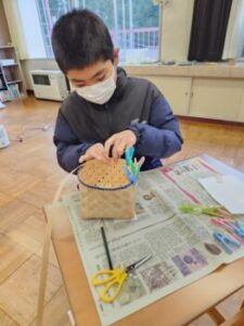 カットした籠の上部に帯を巻き,縁をつくっていきます。ここで初めてボンドが登場します。手際がいいですね~。小菅の伝統工芸を引き継いでもらいたい6年生です。