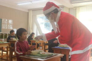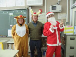小菅小中は,終業式の日まで給食があります。ちょっと早かったですが,サンタさんとトナカイがプレゼントをもって給食におじゃましました。