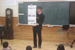 全校で校歌を歌いました。いい声,いい表情,子どもの歌声からはいつも元気をもらいますね!今学期,一日も休まなかった子どもは3人いました。素晴らしい!そのうち2人は,一学期から継続です。その後私から,みんながチャレンジしている『はじめのいっぽ』についての話をしました。概要は,23日に配付した「すげのこ通信」,年内の隣保回覧をご覧ください。『はじめのいっぽ』のポイントは,チャレンジ→勇気・自信→はじめのいっぽ というキーワードで修めました。