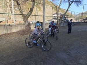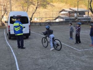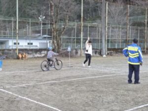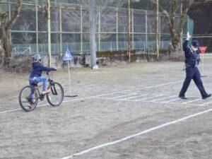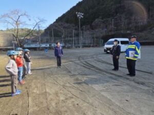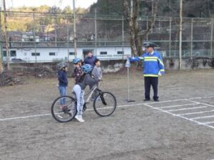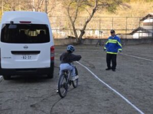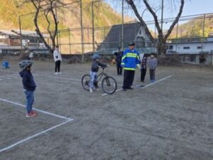 小菅小ではコロナ禍以来久々の自転車教室を3年生対象に行いました。上野原警察署交通課の方と,小菅駐在所の駐在さんのお二人が指導をしてくださいました。交通課の方は以前小菅駐在所に勤務していた方だったので,「○○くん,お巡りさんのこと覚えているか?」「あー,覚えているよ!」なんていうたいへんフレンドリーな感じではじまりました。