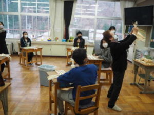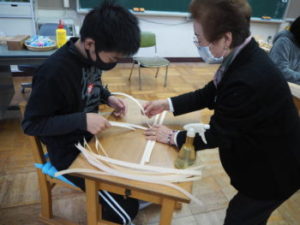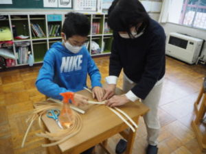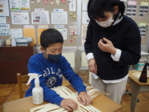 11月27日(金)、6年生は、きおび(木帯)を体験しました。これは「きおび編み」と呼ばれる、小菅村を代表するモノづくり(特産品)です。講師は、小泉みつるさん。使用するのはヒノキで、香りも豊か。きおび一つひとつに刻まれた年輪を眺めながら、制作に取り組みました。さてさて、どんな作品が完成するのかな。