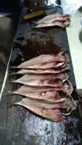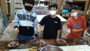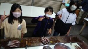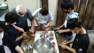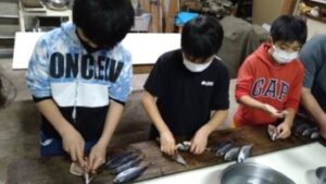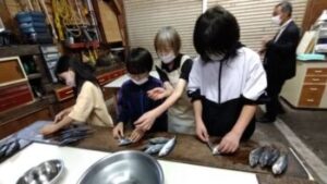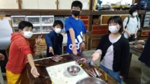 【ひもの開き体験】最初はおっかなびっくりでしたが、丁寧に教えていただいて、見事にアジの開きをつくることができました。