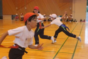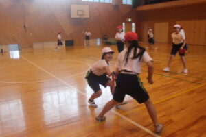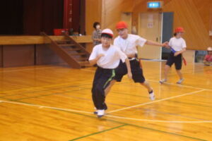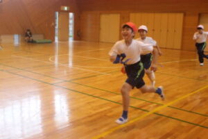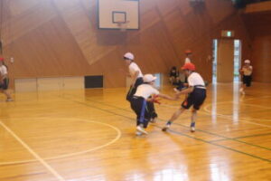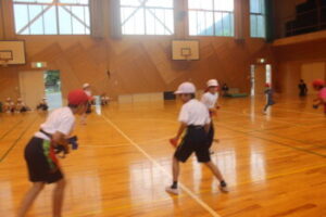 低学年と中学年、それぞれ赤と白に分かれて対戦です。雨のため体育館でしたが、全力で追いかけたり逃げたり・・。