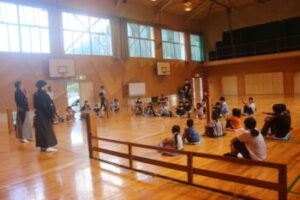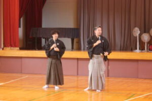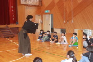 これは文化庁「文化芸術による子供育成推進事業」として今月26日に行われる「大蔵流狂言」公演の事前学習として行ったものです。