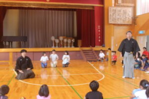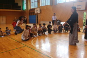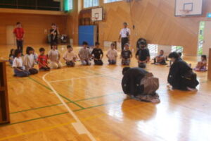 この日はお二人の能楽師の方を講師に、「狂言とは、650年以上続く伝統ある演劇。日常のおかしさを強調して演じるのが特徴。現存する世界最古の演劇。でも決して堅苦しくなく、いわば現代でいうコント、お笑いにあたるもの」と説明を受け、子供たちは「へえ~、そうなんだ~」という表情。