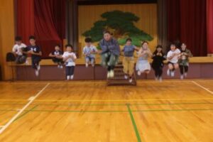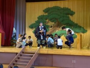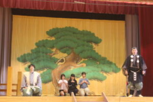 今日は体育館のステージに舞台を作って、本格的な狂言の雰囲気に。