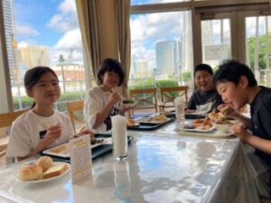 朝食はホテルのバイキング。品数豊富ですが、子どもたちはそれにつられることもなく、いつも食べてるくらいの量だとか言いながら控えめに取っています。昨夜の船でもそうだったのですが、ジュースなど飲み物はおかわり自由なのに取りません。控え目というか、遠慮し過ぎというか……。小菅の子の良さでもありますが。