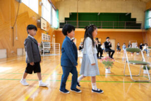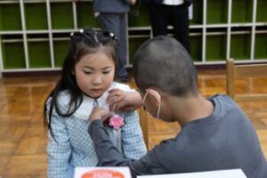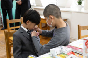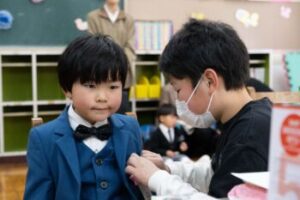 3人 のピカピカの一年生が入学しました。ちょっぴり緊張しがちでしたが,教室に入りお兄さんからリボンをつけてもらうとニッコリ安心した様子。教室でお返事の練習をし,入場を待つばかりとなりました。