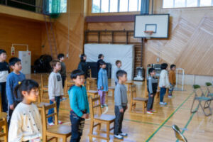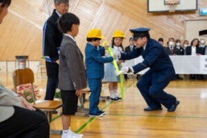 安協の方と駐在所のお巡りさんから,黄色い帽子と傘をいただきました。安全に登校して,事故にあわないようにしましょうね。最後に在校生が素晴らしい歌声で,校歌の斉唱。一日も早く校歌を覚えられるといいですね。