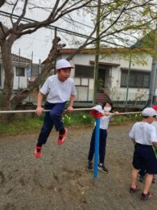 体育は、ブロックごとに行います。3,4年生の体育です。見てください!この足かけ前回り、連続で20回転くらい回りました。「 もうやめよー」と言われるくらいの回転でした。休み時間でも鉄棒は人気です。