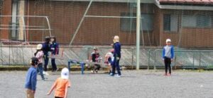 天気のよい日の休み時間は、全校児童が自然と入り交じり、みんなで遊ぶことが多いですね。今日は鬼ごっこです。本気で必死で鬼から逃げ回っていました。