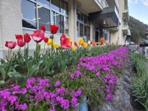 小菅中では今がちょうど「花真っ盛り」といった感じです♪職員室前の花壇や玄関前にはチューリップやシバザクラ、ビオラ等の花がきれいに咲き誇っており、私たちに元気を与えてくれています。