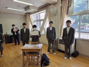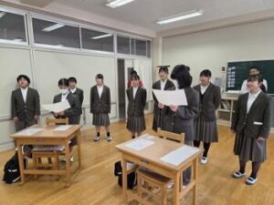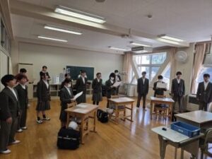 今日の放課後に「生徒会歌練習」がありました。1年生の教室に全校生徒が集まり、2年生徒会の進行で練習開始。まずは2,3年生が歌ってみせます。気づいたら先生方も一緒に歌っていました♪「じゃあ1年生も歌えるところだけでいいので、一緒に歌ってみましょう」と声がかかり、1年生も楽譜を見ながら一緒に歌っていました。全校生徒の人数は少ないのですが、多くの子が気持ち良さそうに歌っていていい感じです♪(全員が気持ち良く歌っている…とまではまだ言えませんね。今後どう気持ちを盛り上げていけるか期待しています。)私も写真なんて撮っていないで早く覚えて一緒に歌わなければ…と反省しました。