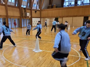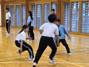 5月2日(金)は天気予報通りの雨。この日の体育は外ではできず、体育館で体力テストの「上体起こし」と「反復横跳び」の後に「スポーツ鬼ごっこ」をしていました。「スポーツ鬼ごっこ」とは、単なる鬼ごっこではなく、2チームに分かれ、自陣の宝を守りながら、相手の宝を奪うといった新感覚の鬼ごっこです。チームで役割分担を決めたり、作戦を立てたりしながら、時間内により多くの宝を奪ったチームの勝利となります。